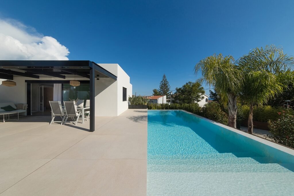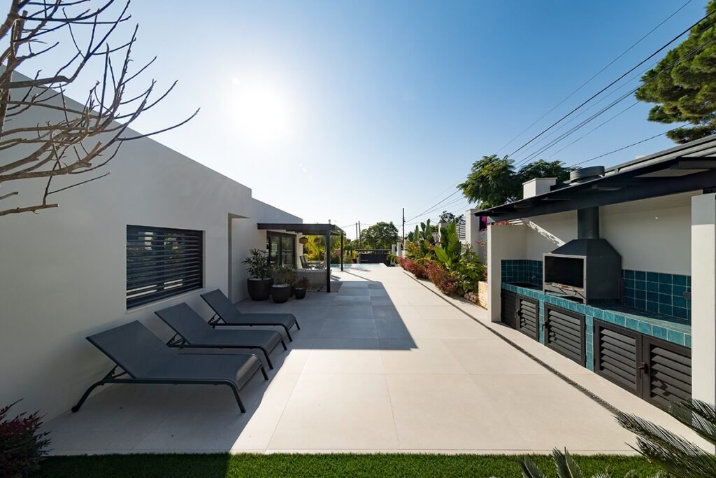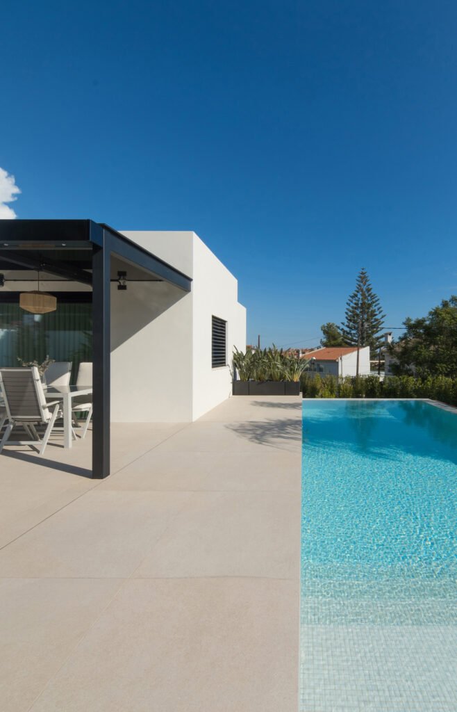 El clima mediterráneo y la orientación de la parcela permitieron proyectar un jardín con porche, piscina desbordante y zona de barbacoa perfectamente integrada. El diseño exterior mantiene la estética del interior, con pavimentos porcelánicos, madera natural, y detalles en negro, creando una continuidad visual clave en los proyectos de arquitectura e interiorismo de alto nivel.