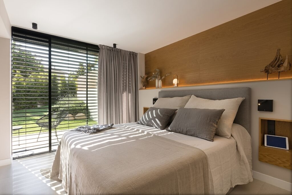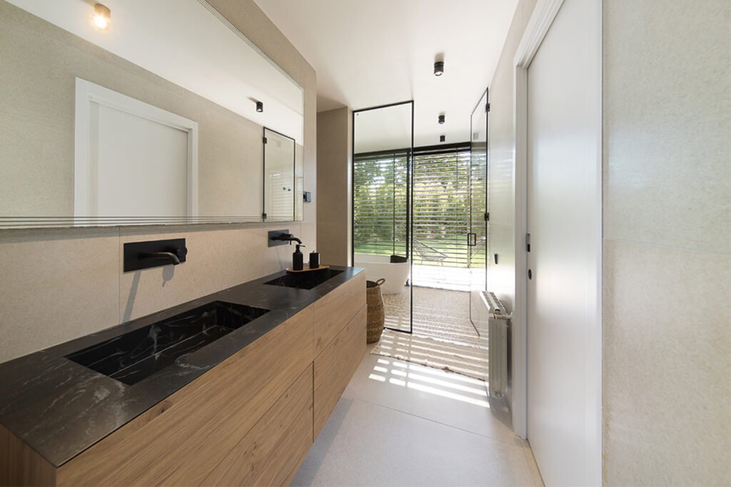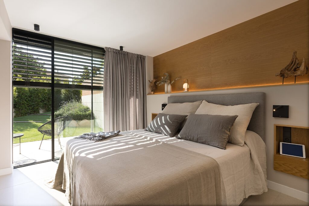 En la planta inferior, encontramos una suite con vestidor y baño, conectada al exterior mediante correderas panorámicas con persianas orientables. También se dispone una zona de servicio con lavadero y habitación auxiliar, además de un espacio polivalente ideal para el teletrabajo o el ejercicio, que refuerza la flexibilidad de la vivienda.