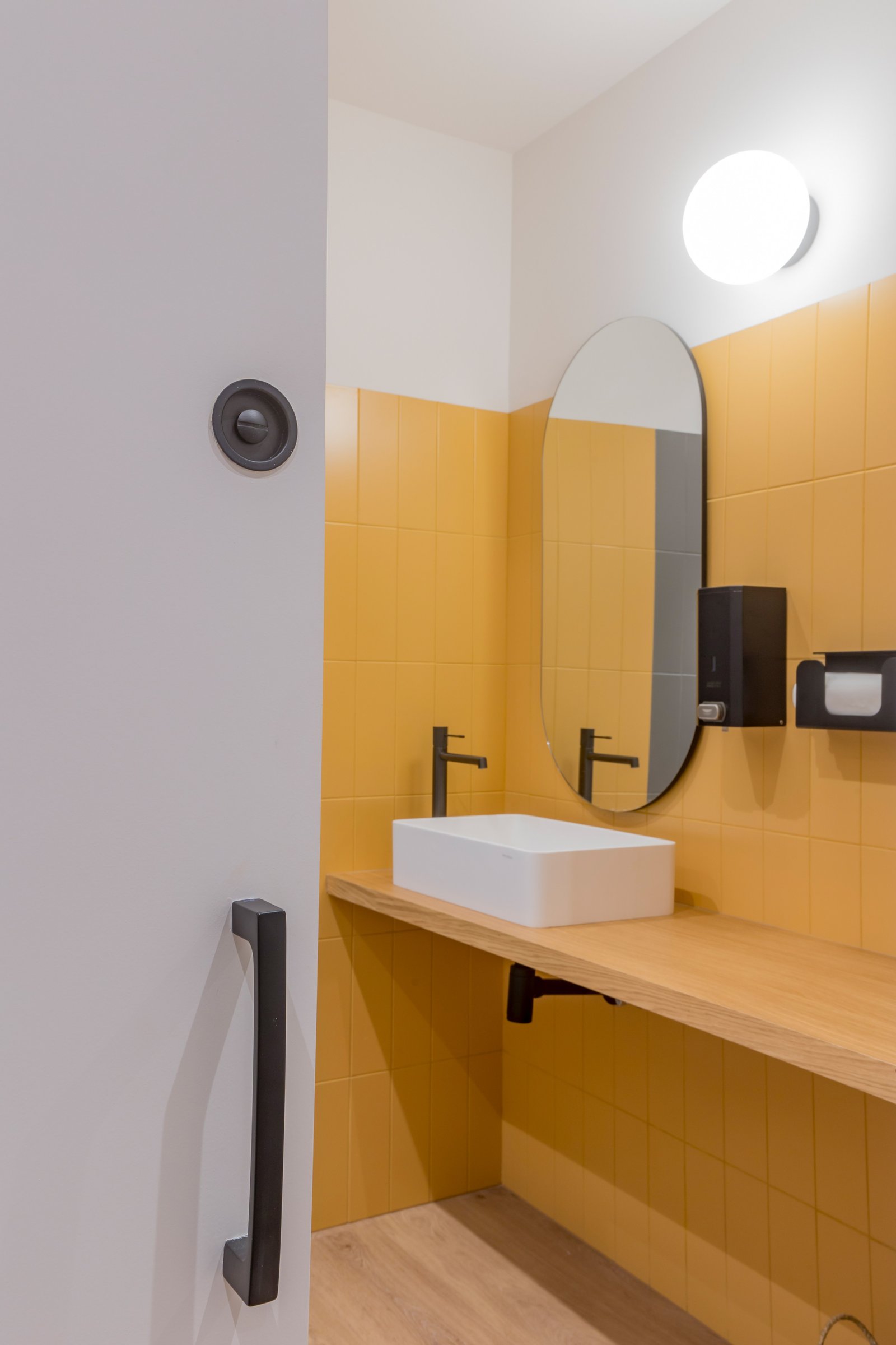 En la parte posterior del local se encuentran las zonas de servicio: un pequeño office, vestuarios y espacios de apoyo tanto para el equipo como para los clientes. Todo ha sido cuidadosamente diseñado para mantener la coherencia estética del conjunto sin perder funcionalidad.