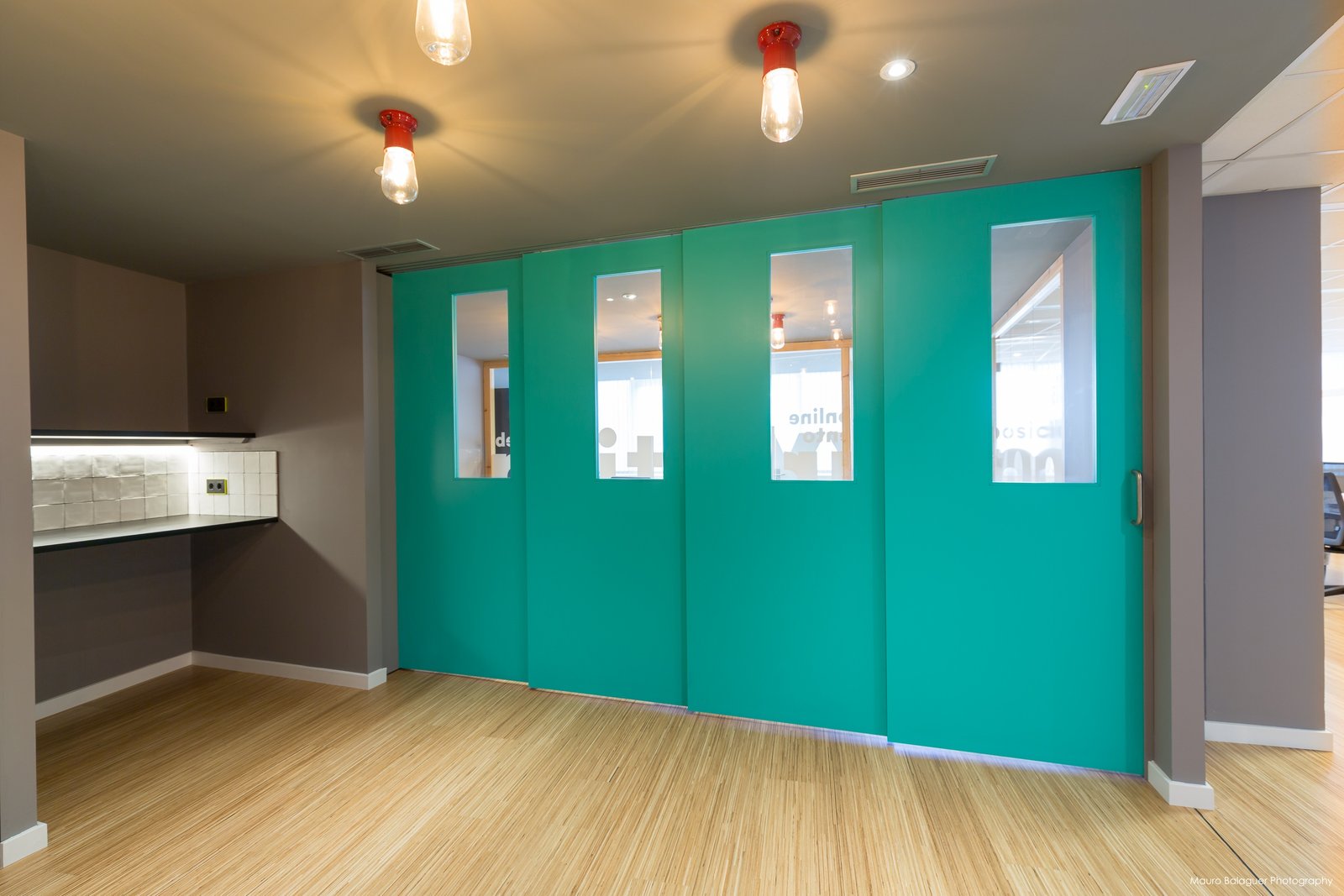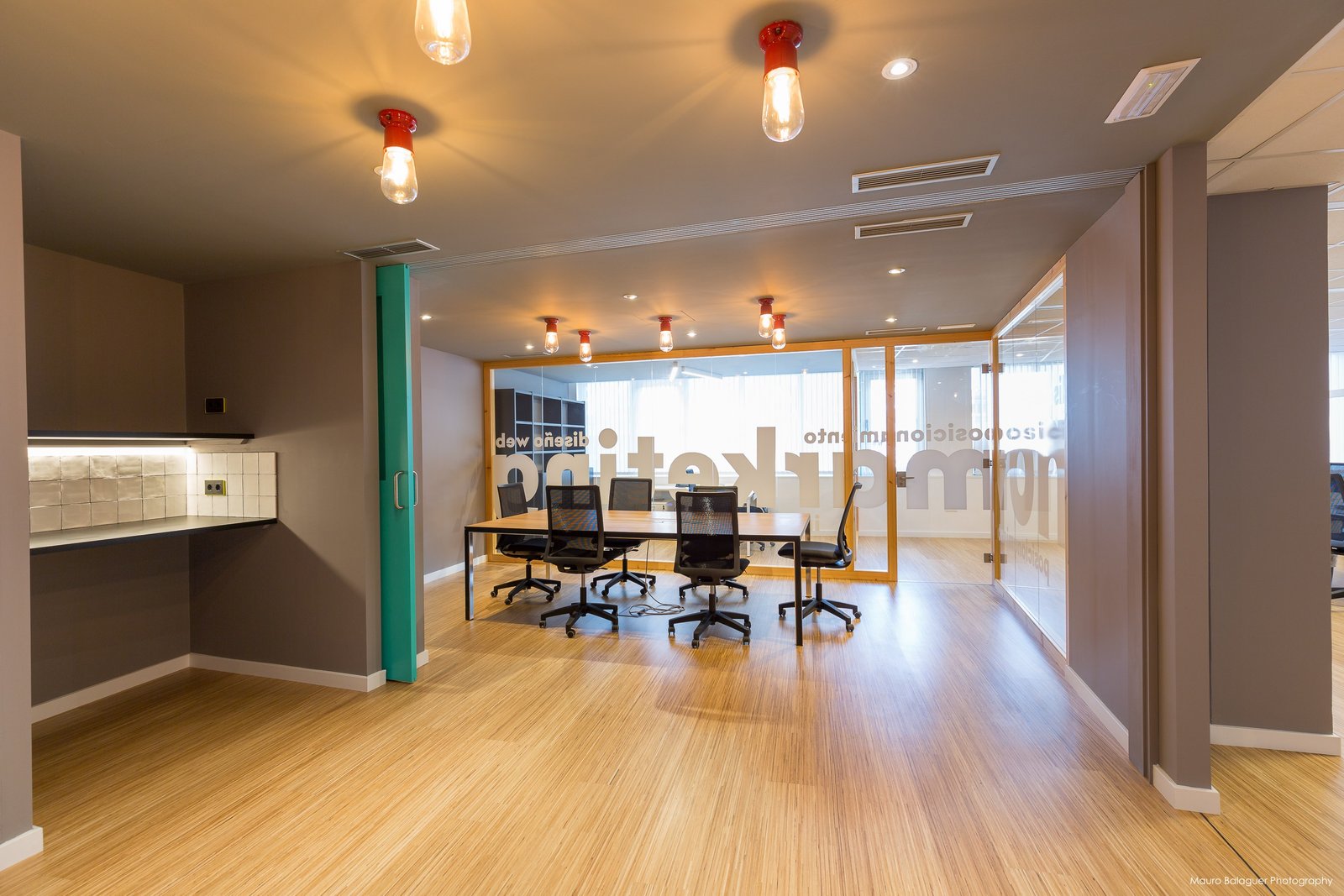 El mobiliario operativo con mesas blancas y leds suspendidos contrasta con la iluminación decorativa cálida y la mesa de madera de la sala de reuniones. El tabique móvil y los grandes vinilos en las mamparas de cristal reflejan la imagen corporativa de la marca.