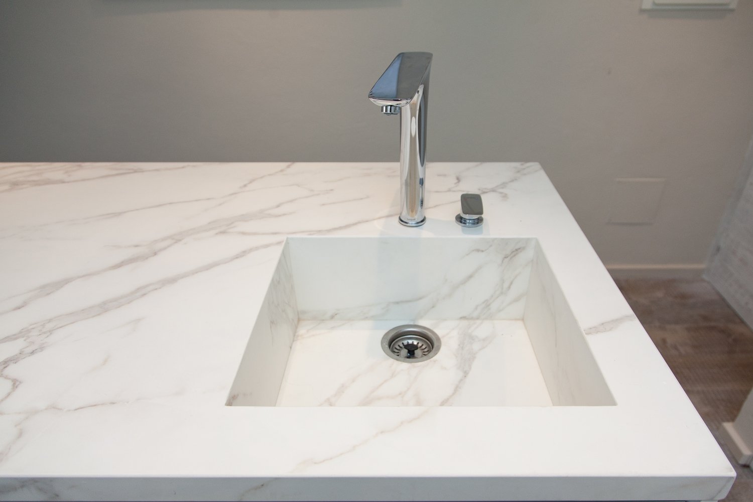 La isla de la cocina en neolith como una pieza central que organiza los espacios de la entrada y sirve a la vez de barra de desayunos.