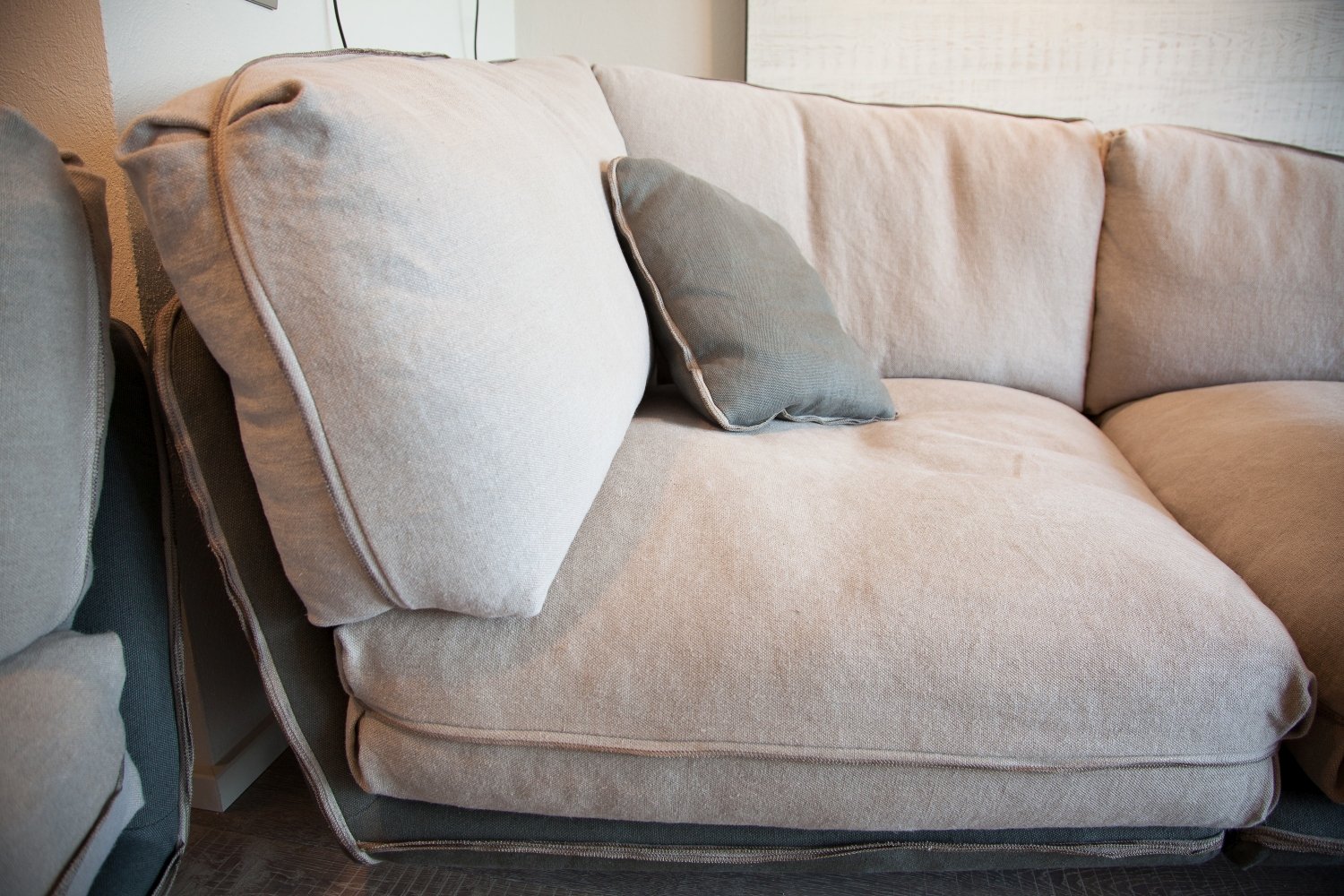 El sofá diseñado a medida para esta vivienda, con sus formas orgánicas y líneas curvas, se adapta al espacio y permite tener un buen descanso mientras contemplamos el mar.