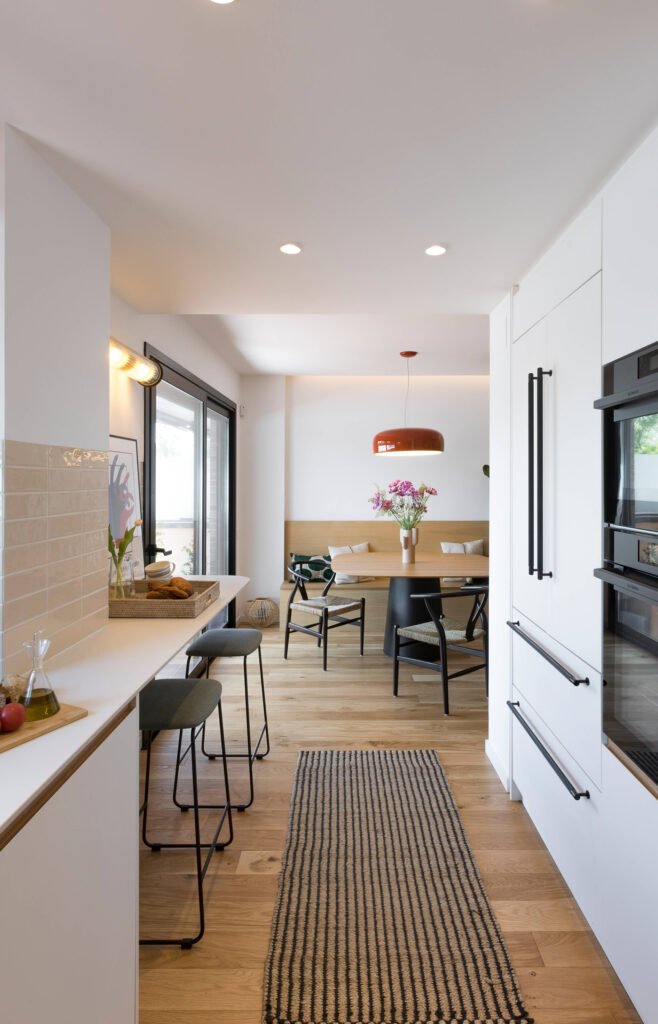 La cocina, de estilo abierto, se integra perfectamente en la zona de día. Cuenta con una barra adosada, mobiliario superior en madera natural, muebles bajos lacados y tiradores en roble. El revestimiento cerámico en las paredes y una nevera americana refuerzan el carácter práctico y elegante del espacio.