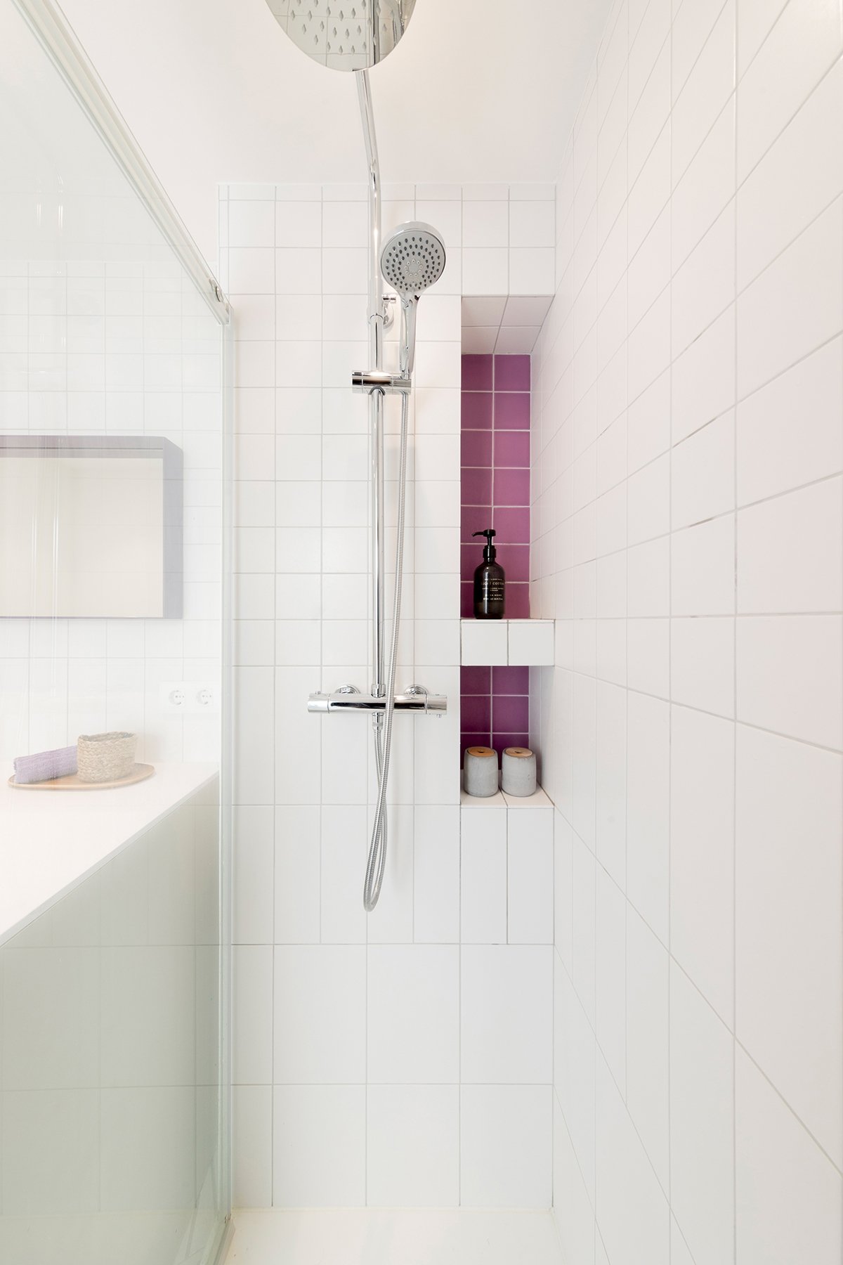 La pieza porcelánica hexagonal del baño en color blanco con detalles en gris combina con el mueble en el mismo tono. La neutralidad de colores y el blanco de la baldosa da serenidad en este baño pequeño. Aportamos ese toque especial con un acento de color lila en las baldosas de 10x10cm de la hornacina de la ducha. El resultado es un baño atemporal, personalizado y a medida al añadir el color favorito de nuestra clienta.