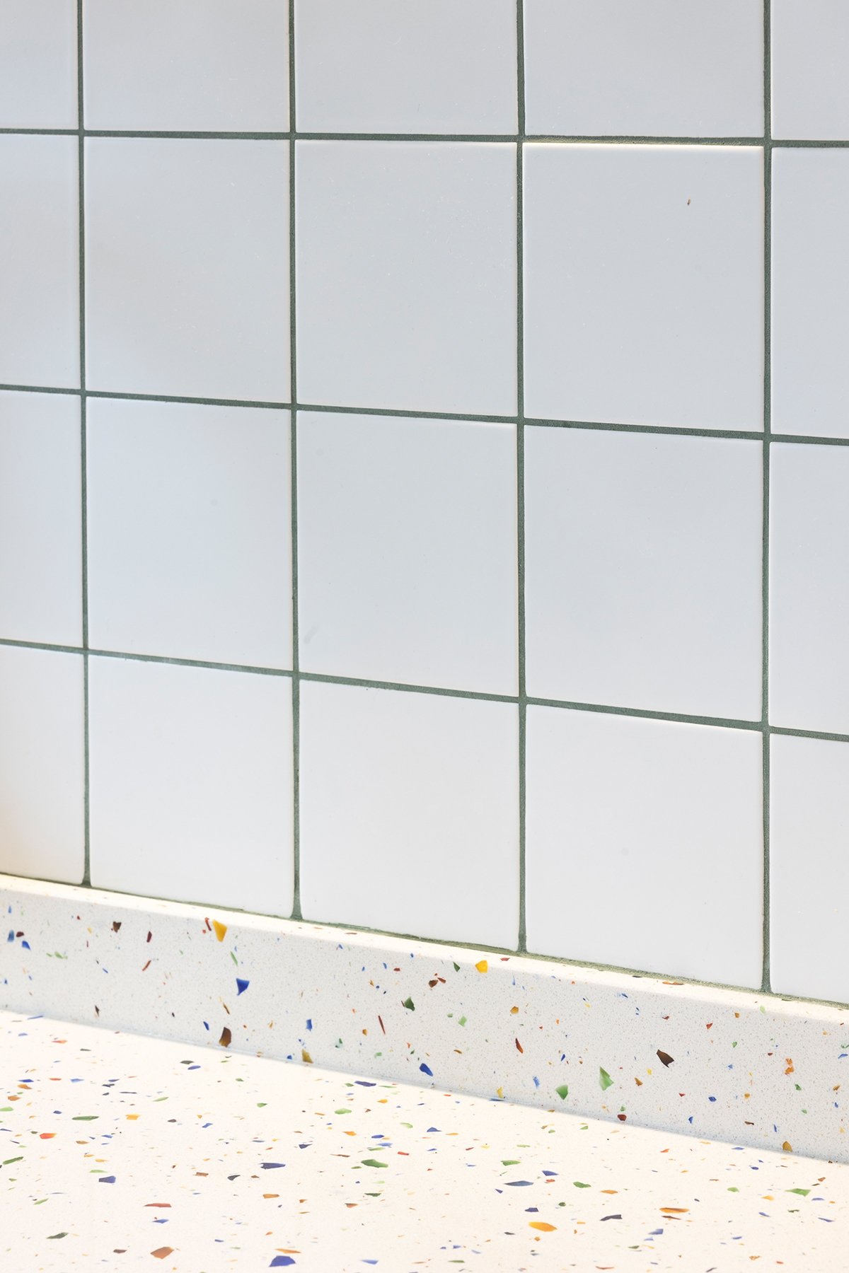 Otro elemento original es el despiece geométrico de las baldosas del baño, que empieza por dos franjas de pieza mediana de 30x20cm, luego sigue en un formato alargado de 30x10cm y se acaba con la pieza pequeña de 10x10cm.